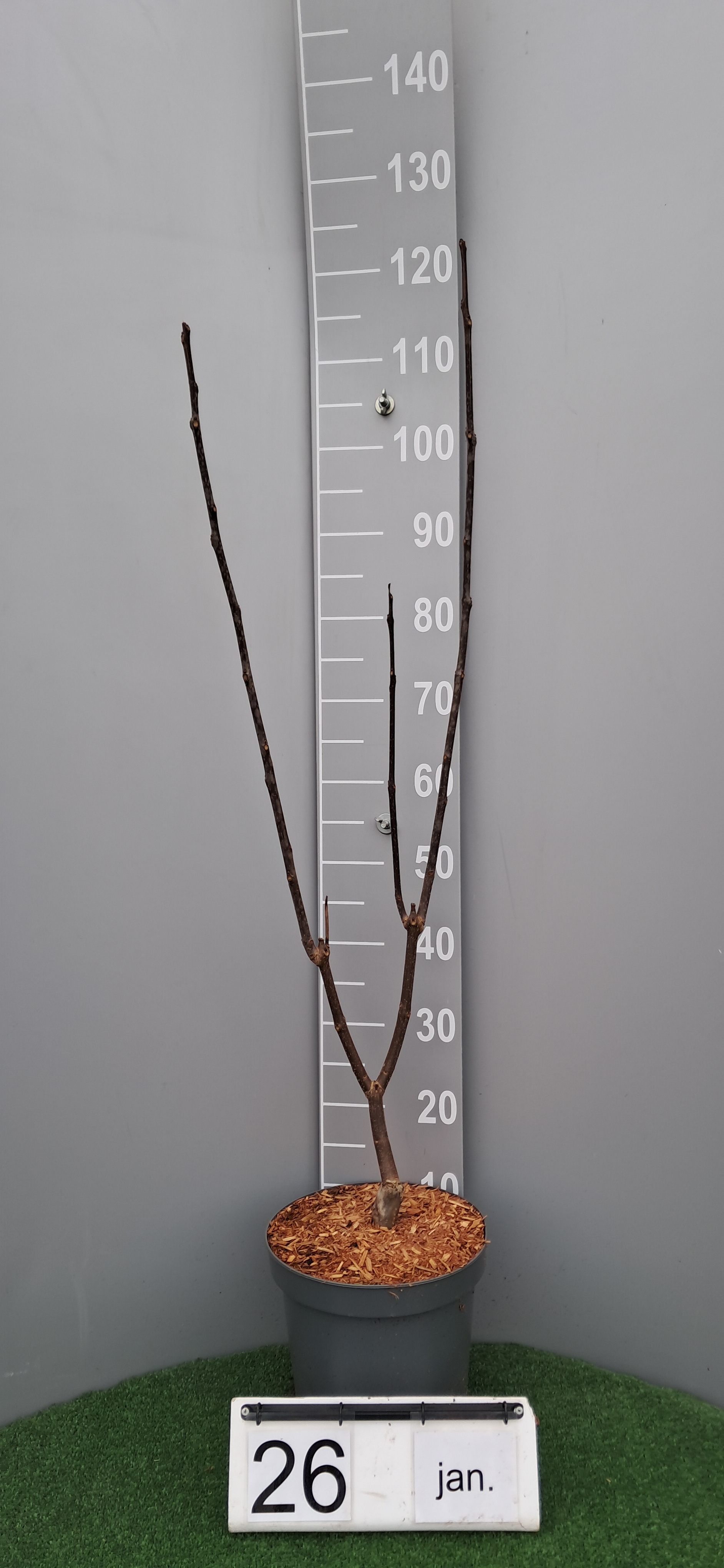 Planten: De pot 10 minuten in een emmer water laten staan, daarna in de tuin uitplanten. Positie: volle zon. Bloeiperiode : juli-augustus, wit-rode bloemen. Hoogte: 5-10 m. Snoeien: in de winter. Gebruik: Geschikt voor decoratie, niet voor consumptie. Bladkleur: erg donkergroen, jong blad purper.